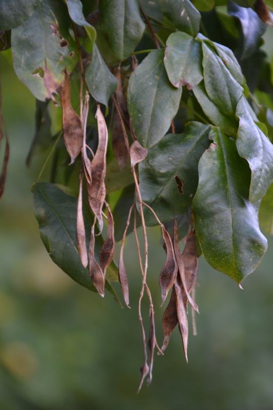 The young twigs are grey and downy at the top, and the leaves are trifoliate. It never becomes a very tall tree and often grows with a shrub habit - one way that enables it to rejuvenate. The laburnum pods resemble flat green beans; the seeds however are highly toxic.